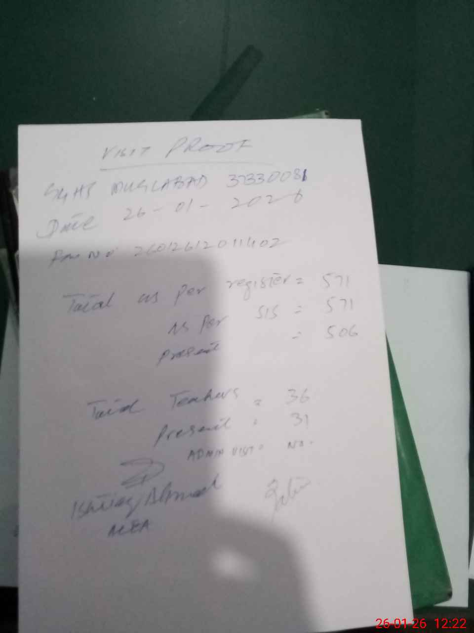 | Attendance Register | Head Teacher | MEA with School | Visit Proof |