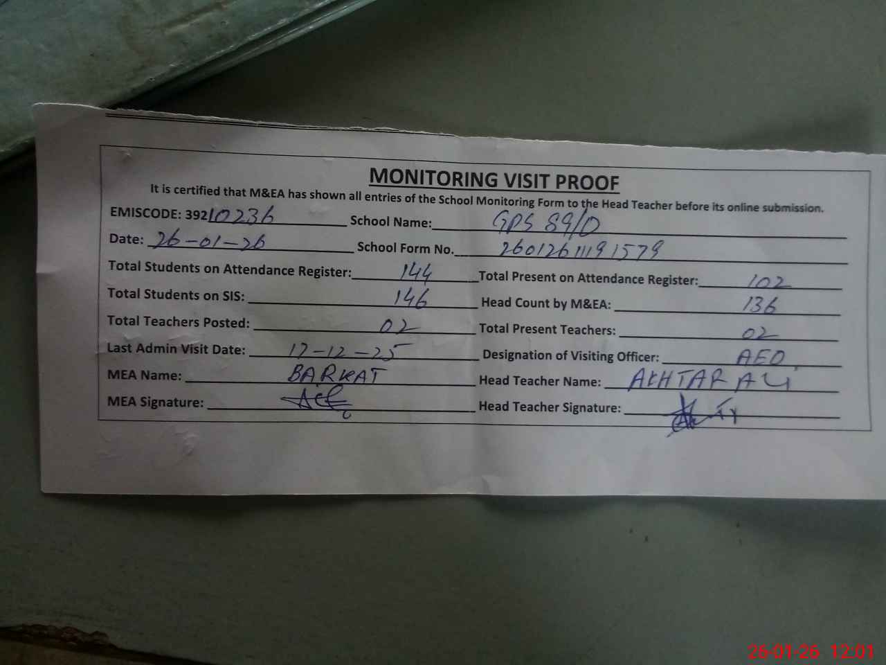 | Attendance Register | Head Teacher | MEA with School | Visit Proof |
