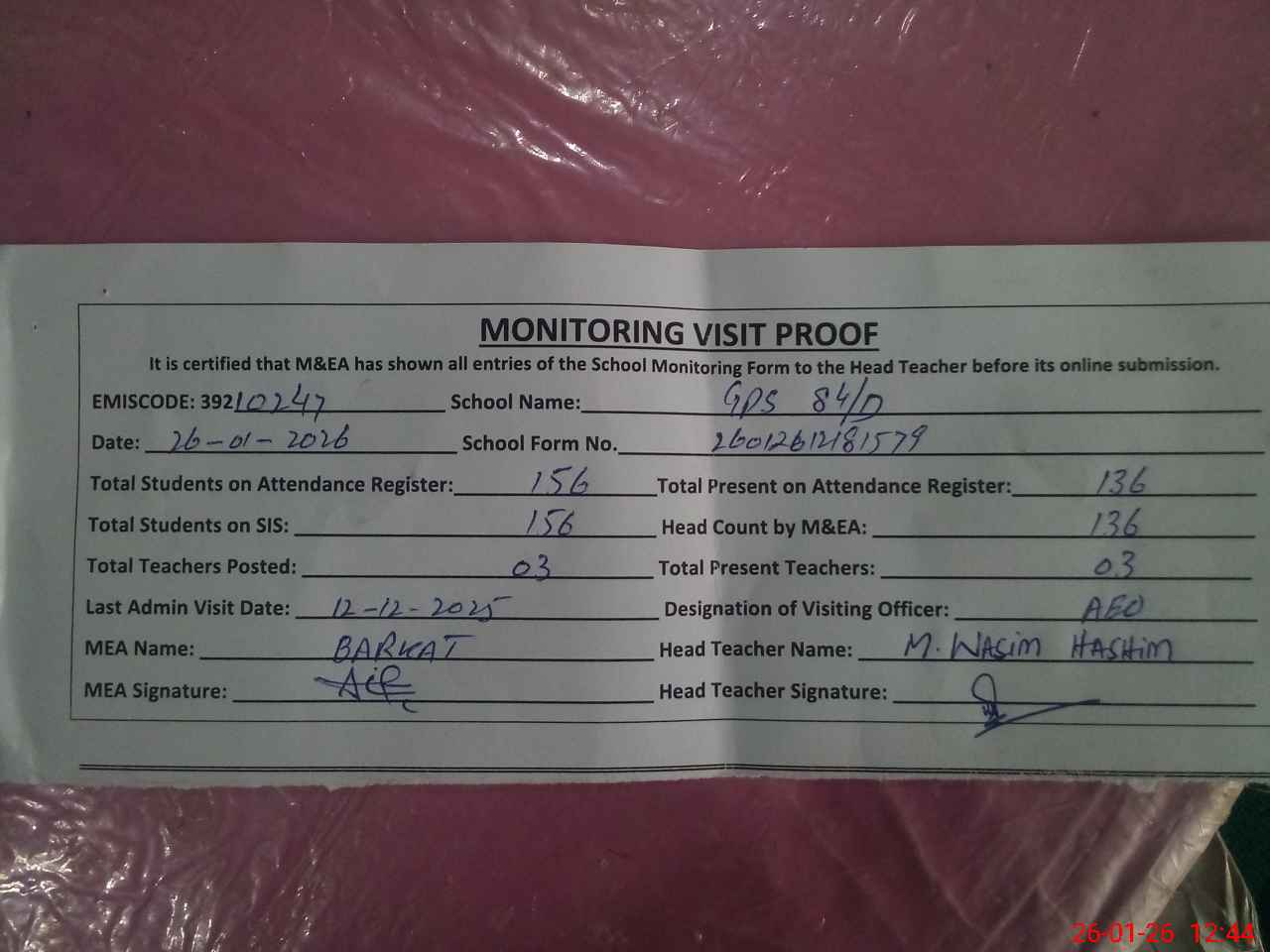 | Attendance Register | Head Teacher | MEA with School | Visit Proof |