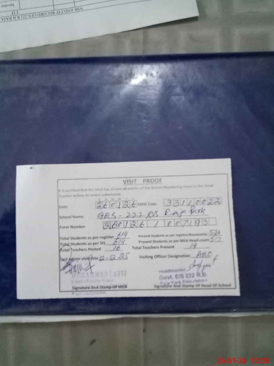 | Attendance Register | Head Teacher | MEA with School | Visit Proof |
