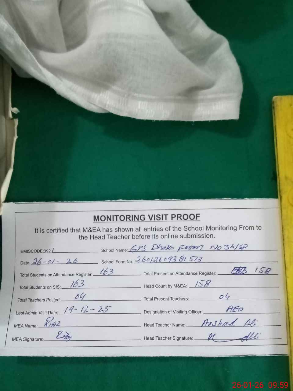 | Attendance Register | Head Teacher | MEA with School | Visit Proof |
