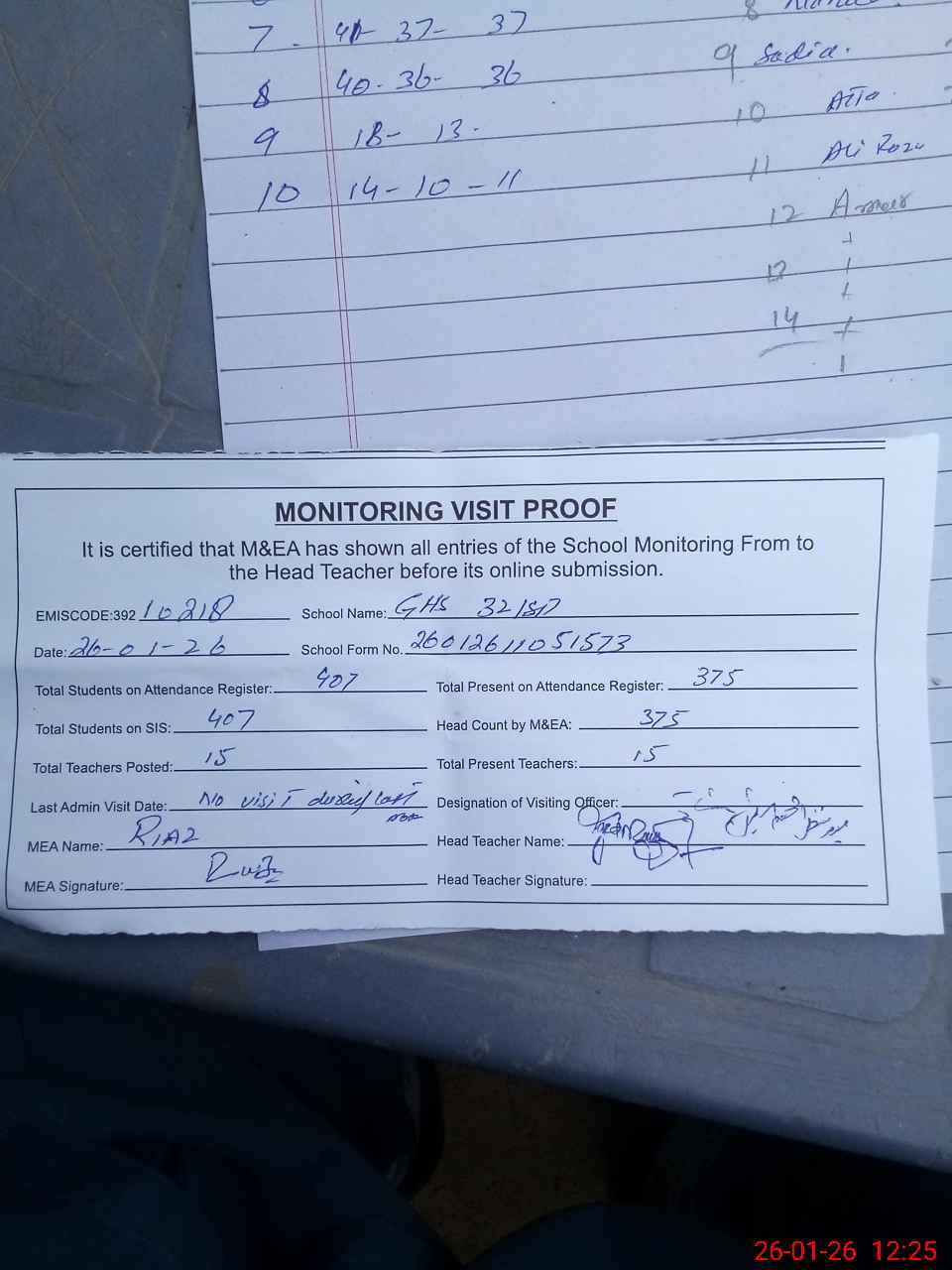 | Attendance Register | Head Teacher | MEA with School | Visit Proof |