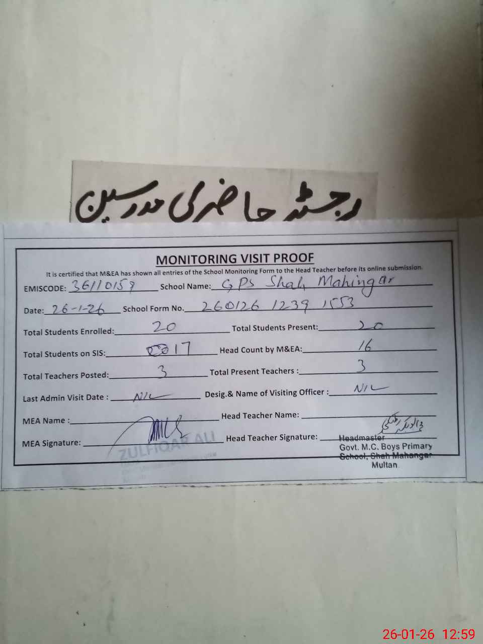 | EMIS Code: 36110159 | Name of School: GPS MC SHAH MAHINGAR INSIDE BOHAR GATE | |||