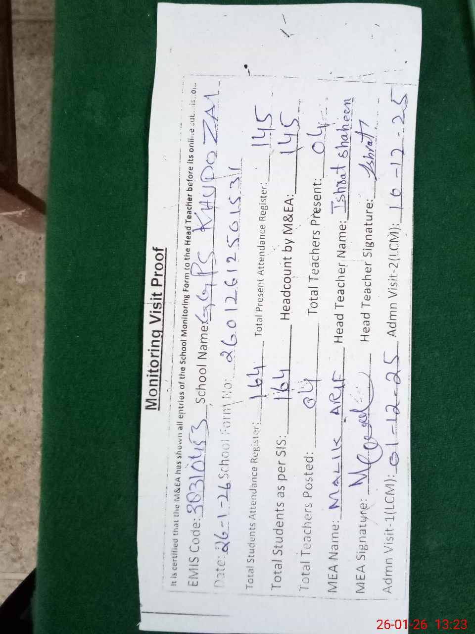 | Attendance Register | Head Teacher | MEA with School | Visit Proof |