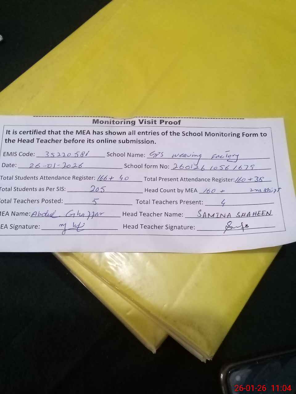 | Attendance Register | Head Teacher | MEA with School | Visit Proof |