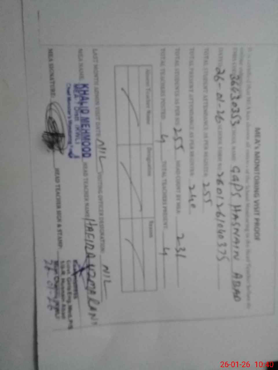 | Certified that this School was Inspected by the Undersigned MEA/DMO Today and the Information Stated Above is as Per Record. | |||||
