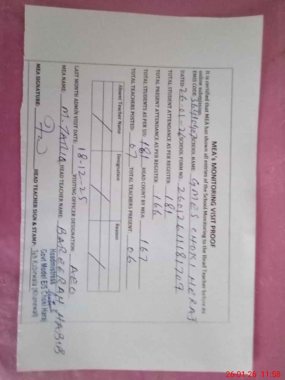 | Attendance Register | Head Teacher | MEA with School | Visit Proof |