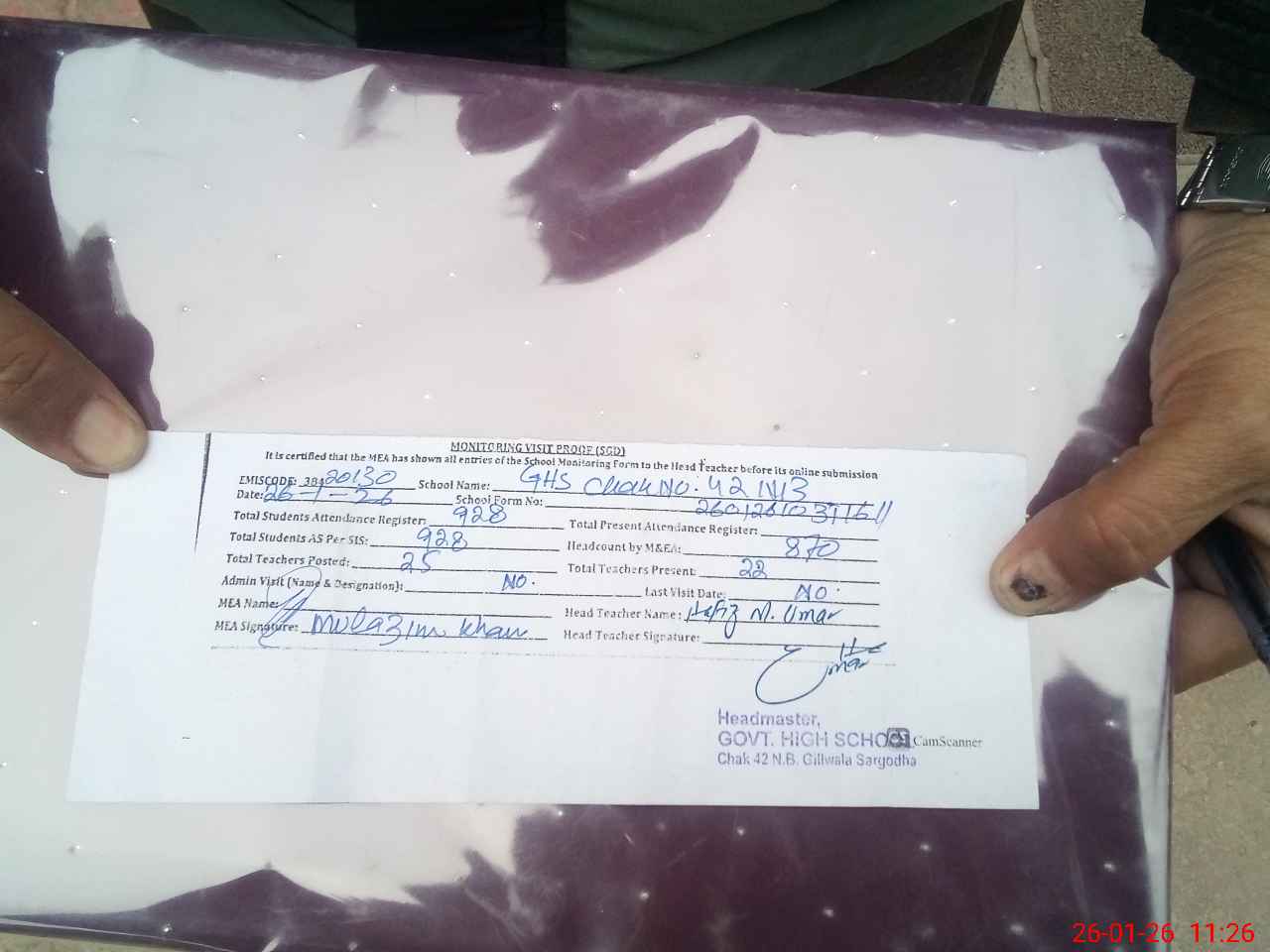 | Attendance Register | Head Teacher | MEA with School | Visit Proof |