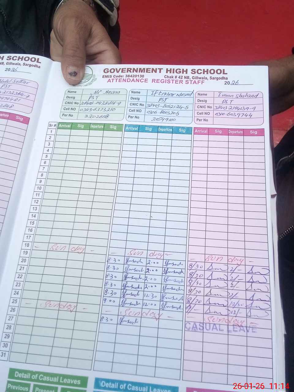 | CNIC | Full Name | Designation | R/C | Absence during last cal. month |