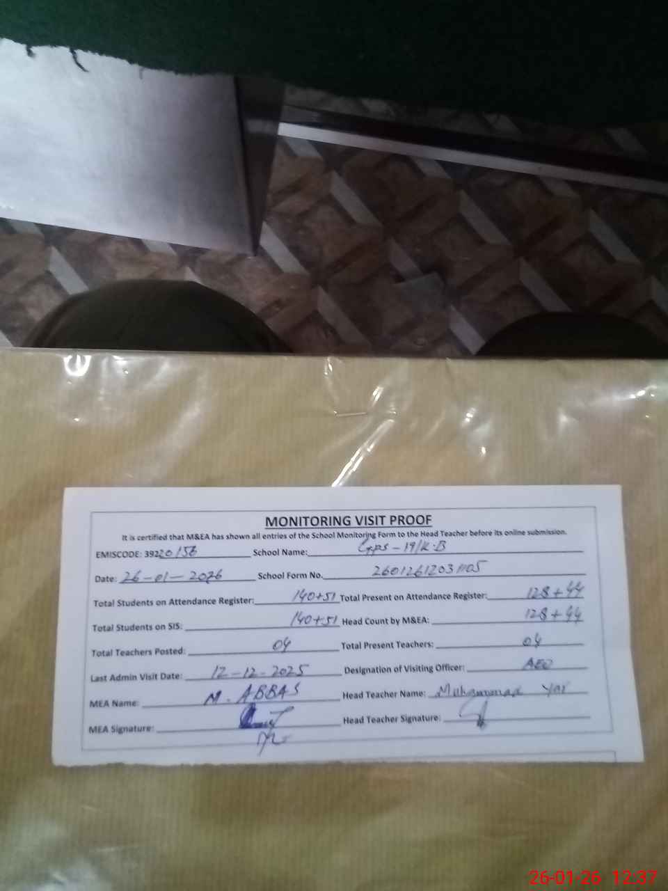 | Attendance Register | Head Teacher | MEA with School | Visit Proof |