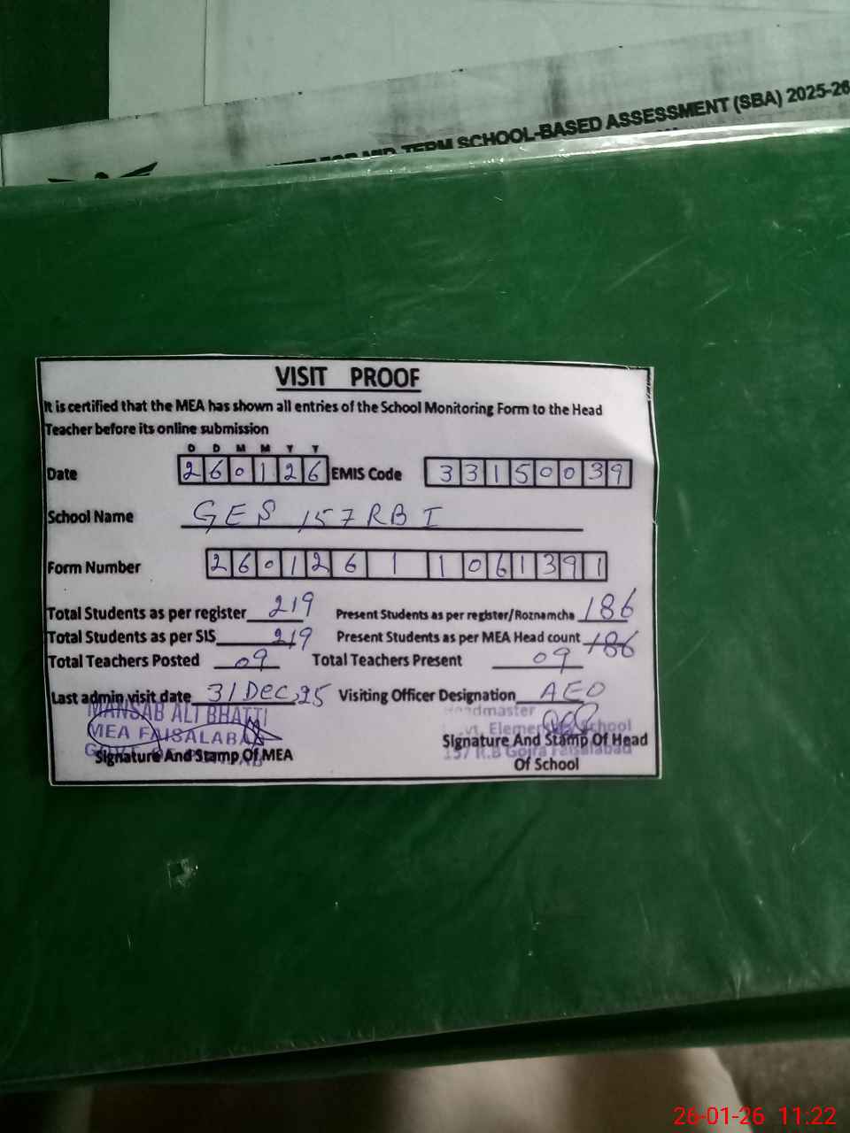 | Attendance Register | Head Teacher | MEA with School | Visit Proof |