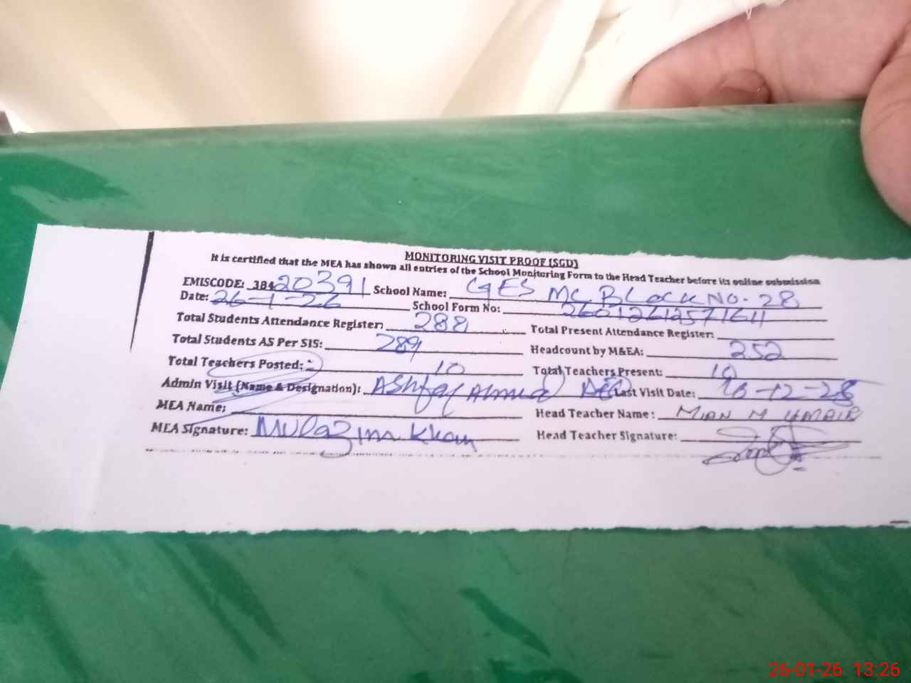 | Attendance Register | Head Teacher | MEA with School | Visit Proof |