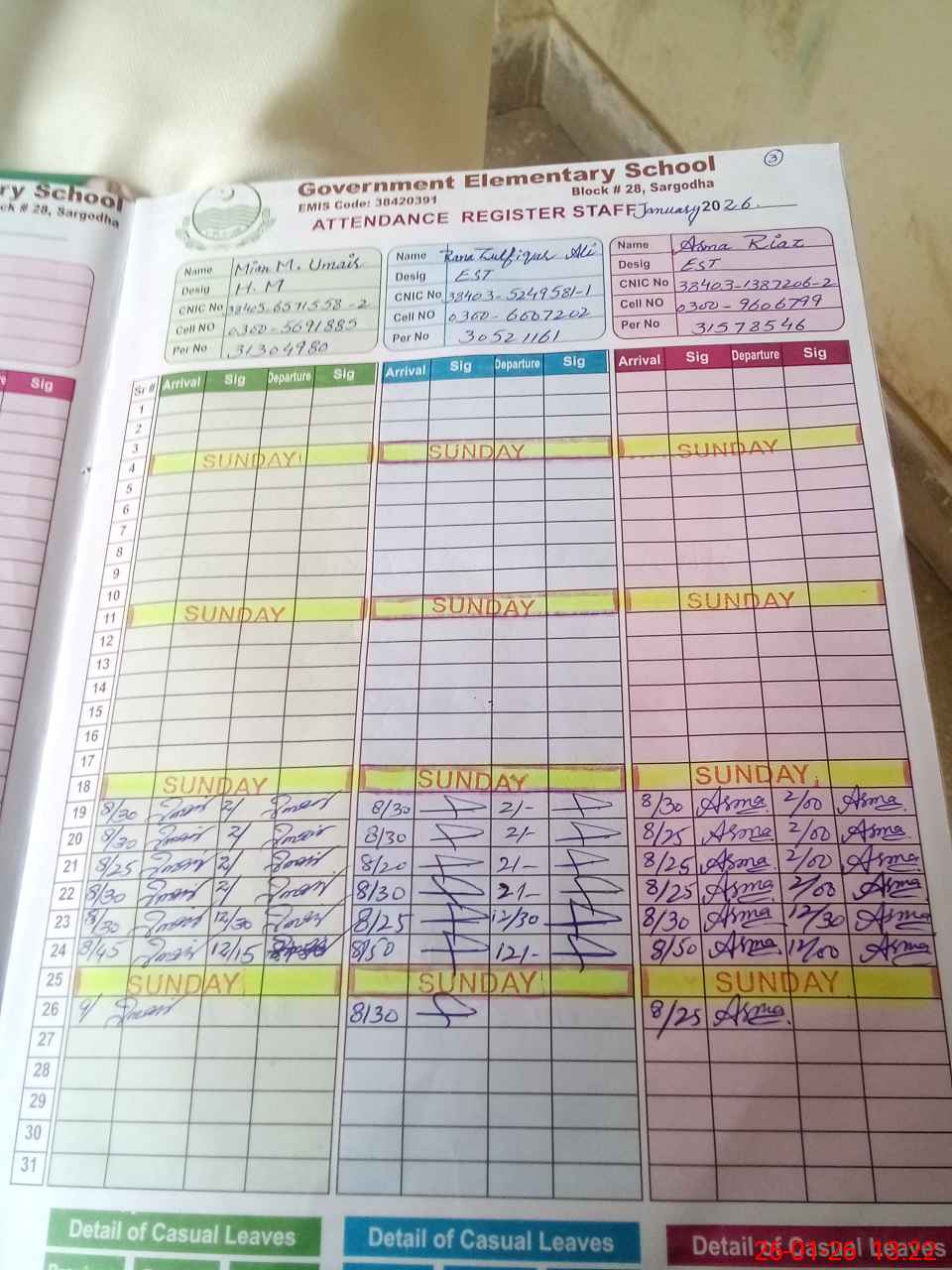 | CNIC | Full Name | Designation | R/C | Absence During Last Calender Month |