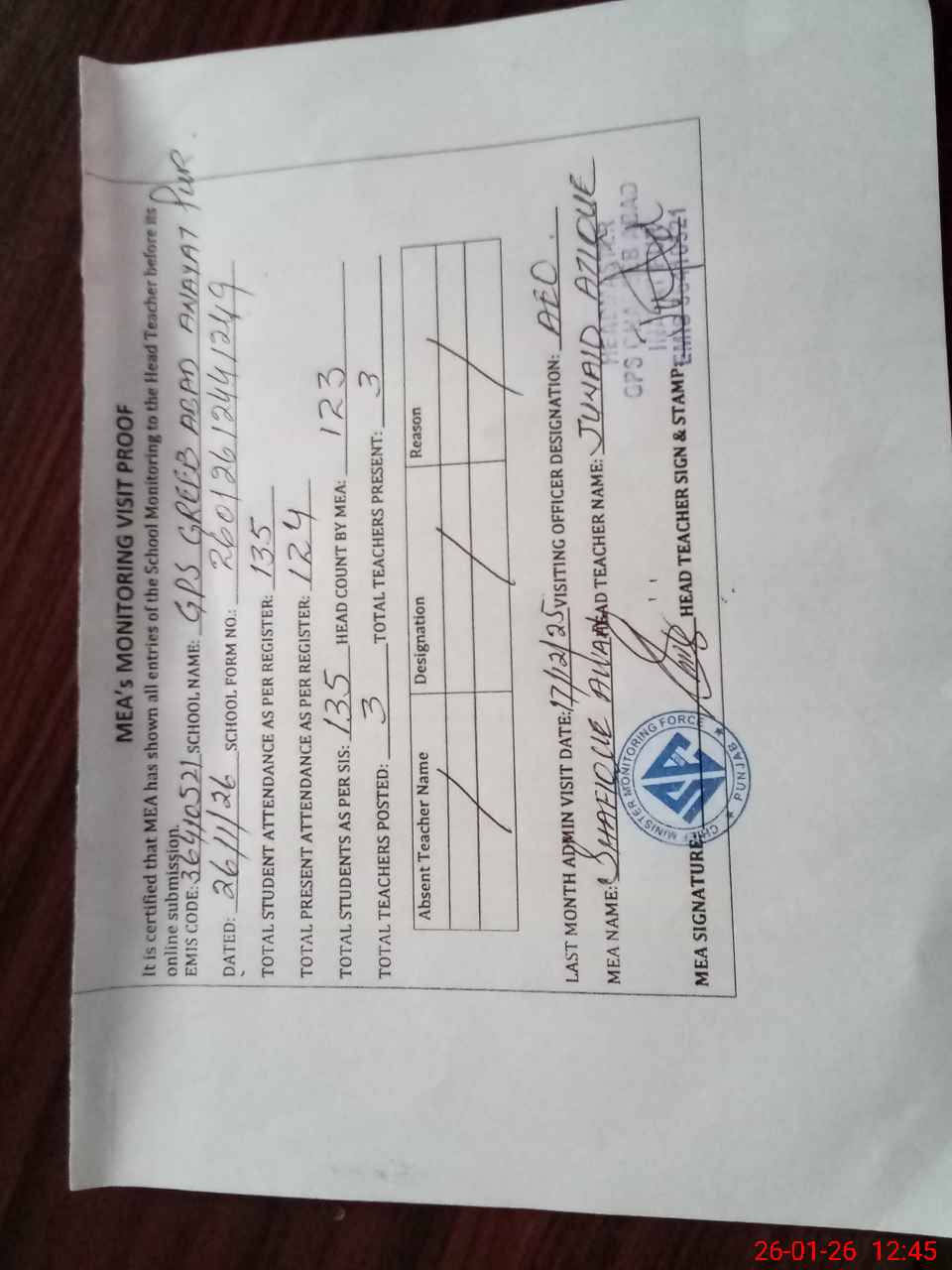 | Certified that this School was Inspected by the Undersigned MEA/DMO Today and the Information Stated Above is as Per Record. | |||||
