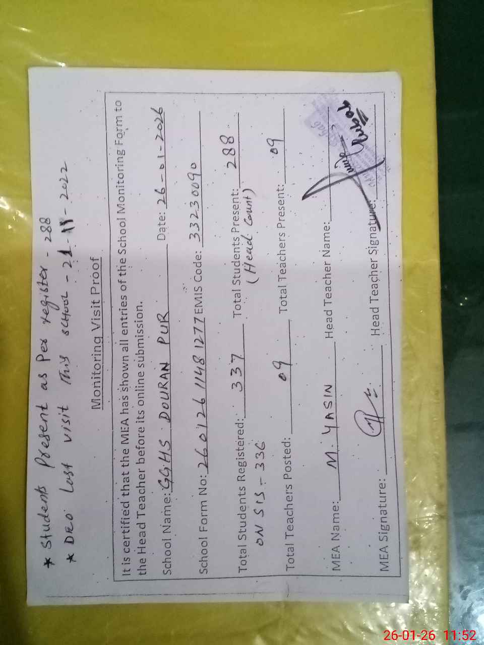 | EMIS Code: 33230090 | Name of School: GGHS DOURAN PUR | |||