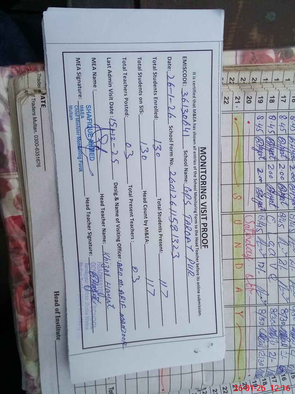 | Attendance Register | Head Teacher | MEA with School | Visit Proof |