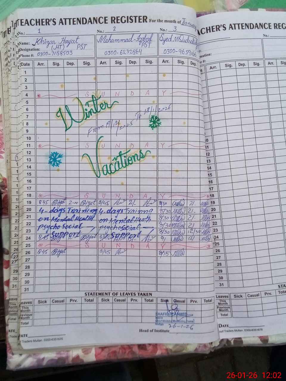 | Name: KH**** HA**** Designation: (School Headmaster's/Headmistress's) INCHARGE Phone/Cell Number: 03**** |