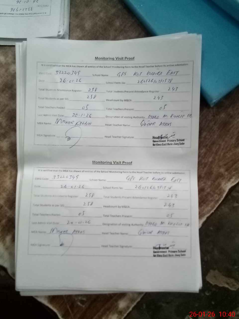 | Attendance Register | Head Teacher | MEA with School | Visit Proof |