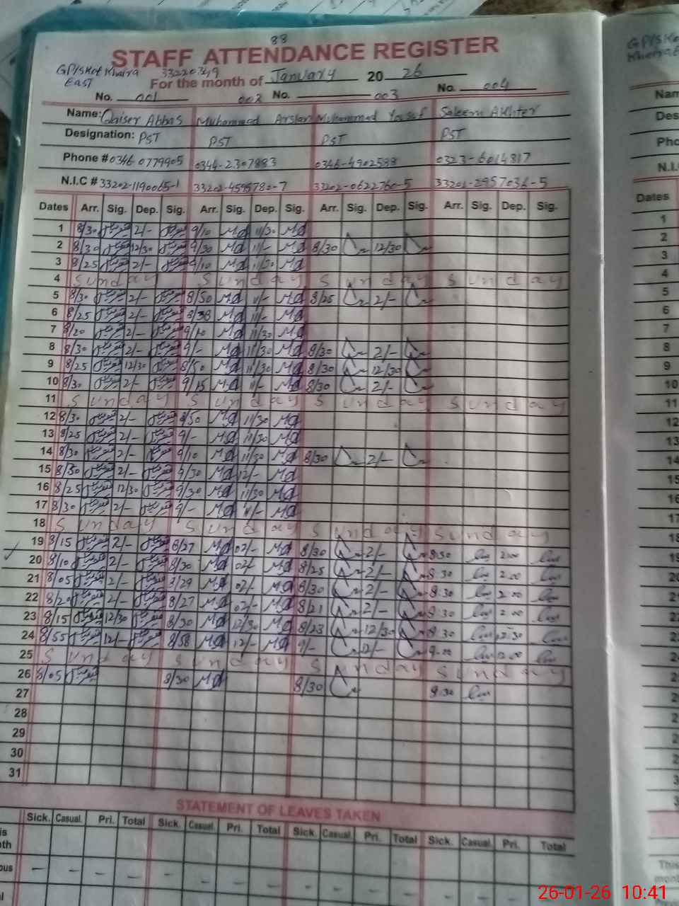 | CNIC | Full Name | Designation | R/C | Absence during last cal. month |