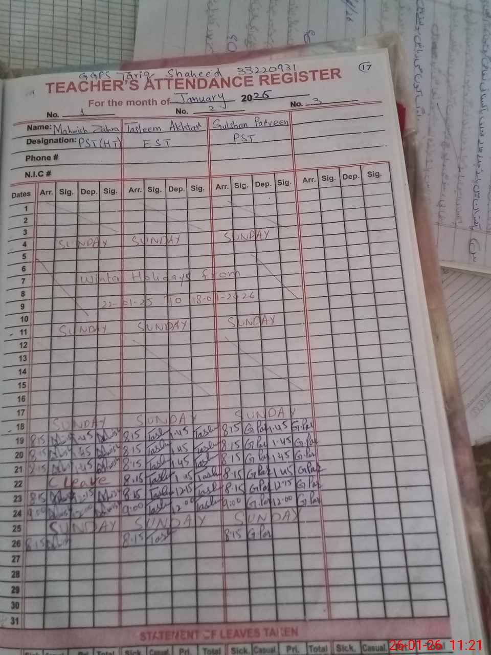 | CNIC | Full Name | Designation | R/C | Absence During Last Calender Month |