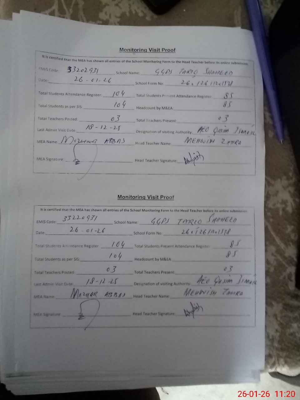 | Attendance Register | Head Teacher | MEA with School | Visit Proof |
