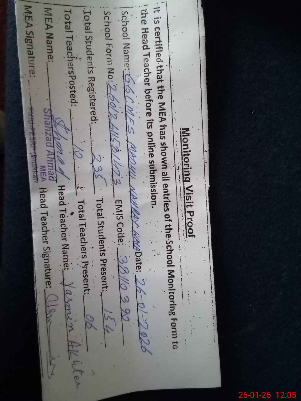 | Monitoring Date: 26-01-2026 | Start Time: 26-01-2026 11:36 AM | End Time: 26-01-2026 12:09 PM | Name of MEA: SH**** AH**** | |