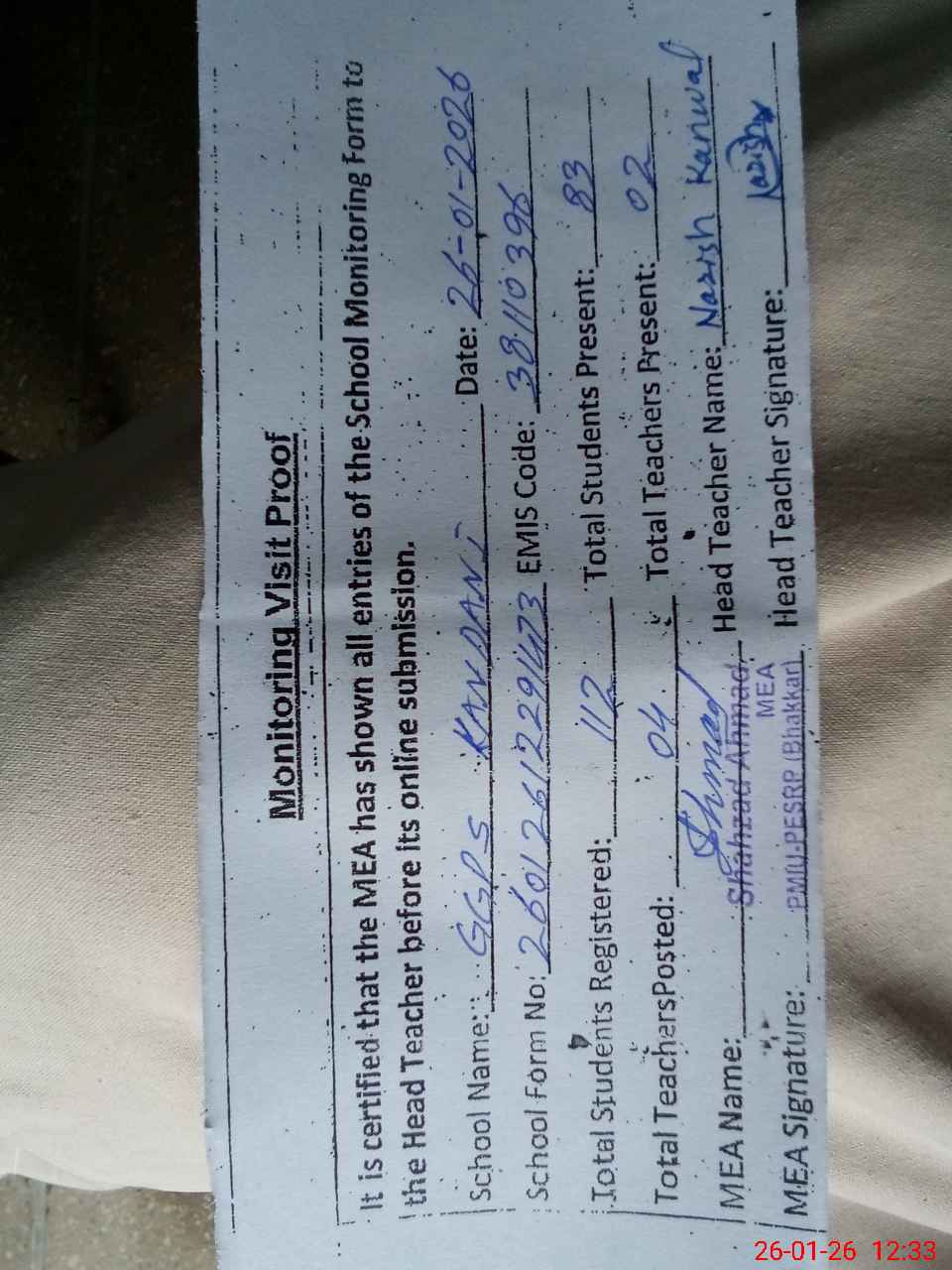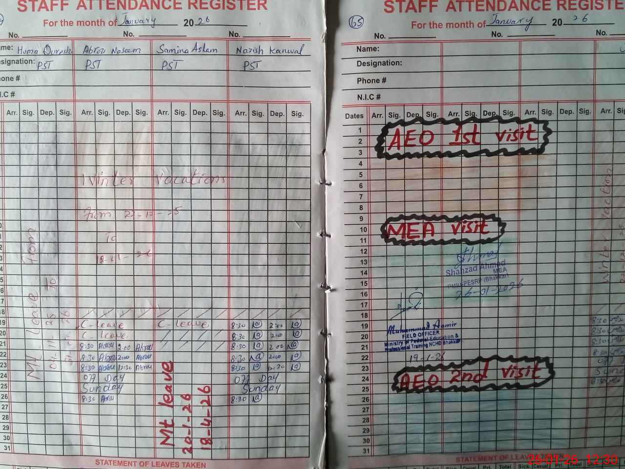 | Attendance Register | Head Teacher | MEA with School | Visit Proof |