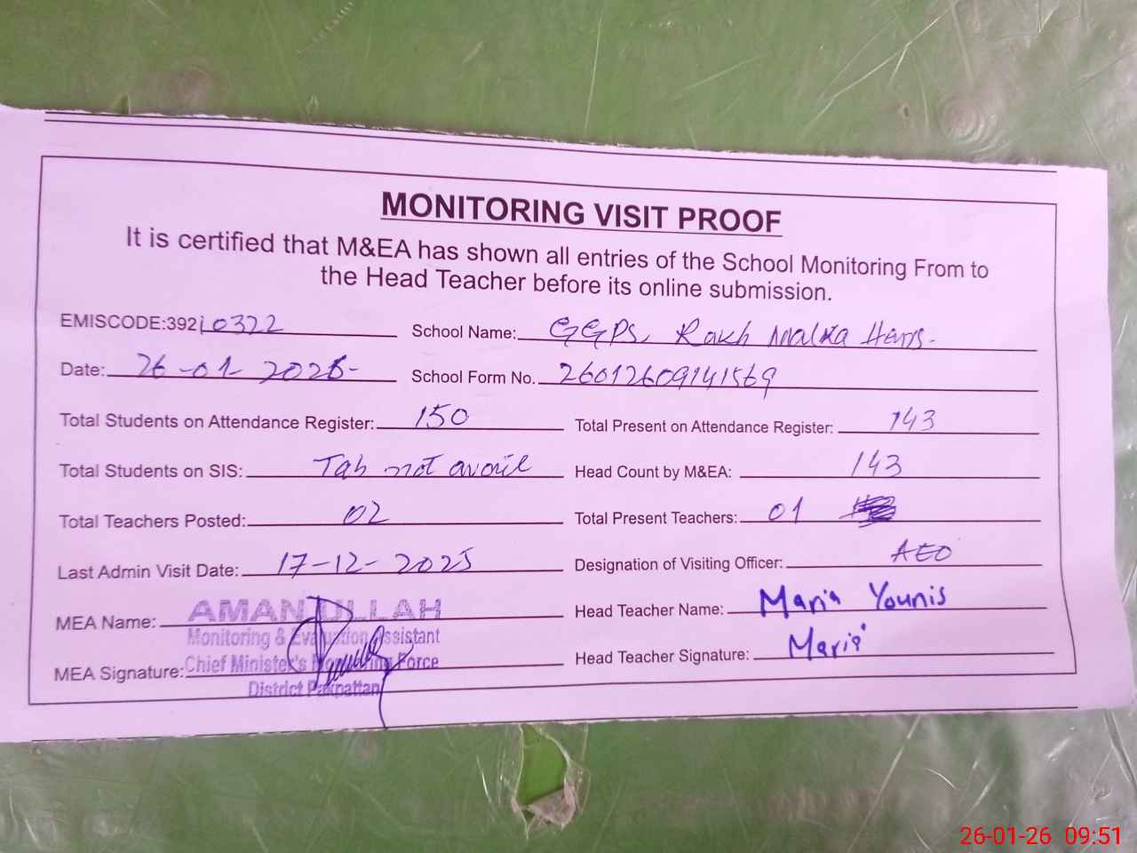 | Attendance Register | Head Teacher | MEA with School | Visit Proof |