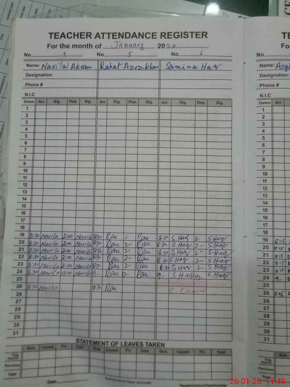| CNIC | Full Name | Designation | R/C | Absence During Last Calender Month |