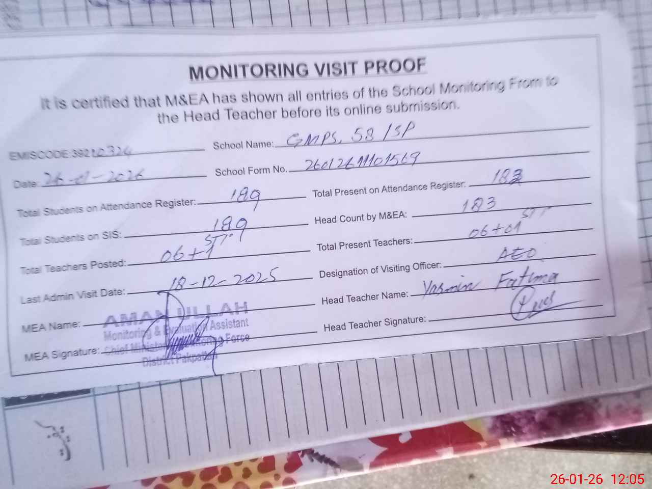 | Attendance Register | Head Teacher | MEA with School | Visit Proof |