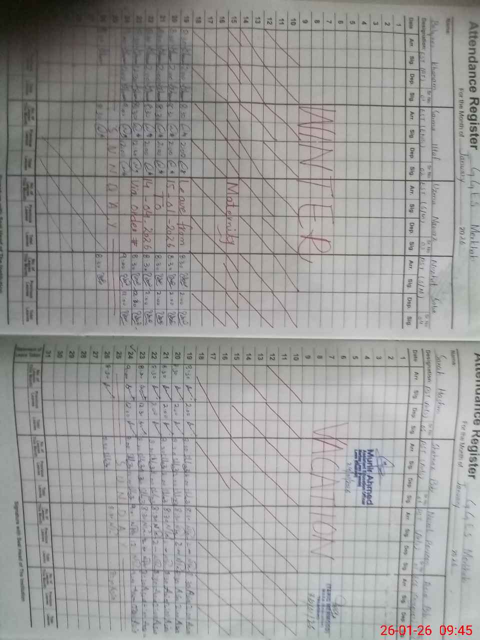 | Remarks (Use Separate Page if Required): EST UZMA NAWAZ maternity leave since 14 Jan is waiting for approval of head hence marked unauthorized absent | |||||