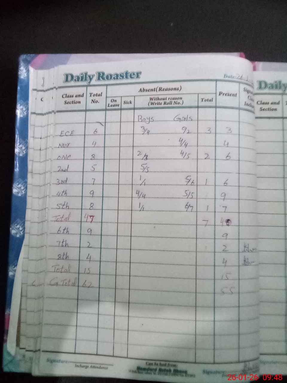 | Total Students Present | 0 | 3 | 6 | 5 | 6 | 9 | 7 | 9 | 2 | 4 | 55 | |||||