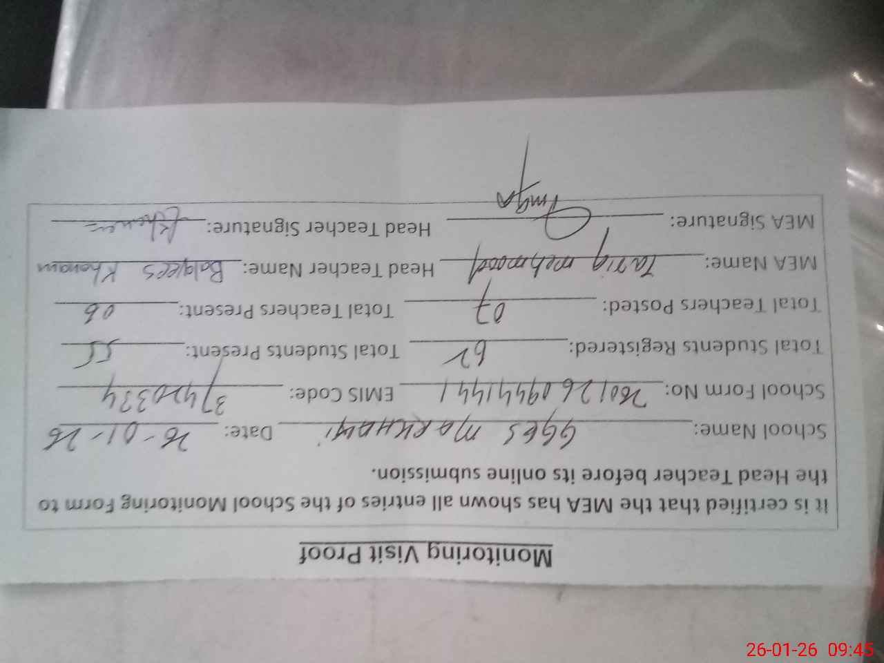 | Attendance Register | Head Teacher | MEA with School | Visit Proof |