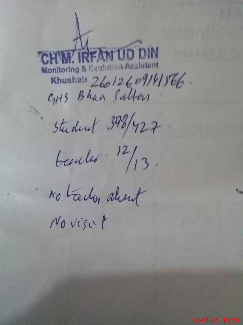 | Remarks (Use Separate Page if Required): ghs bhan sultan wala student on sis 432 student on register 427 head count 398 no teacher absent one on leave no visit dangerous room repairing required | |||||