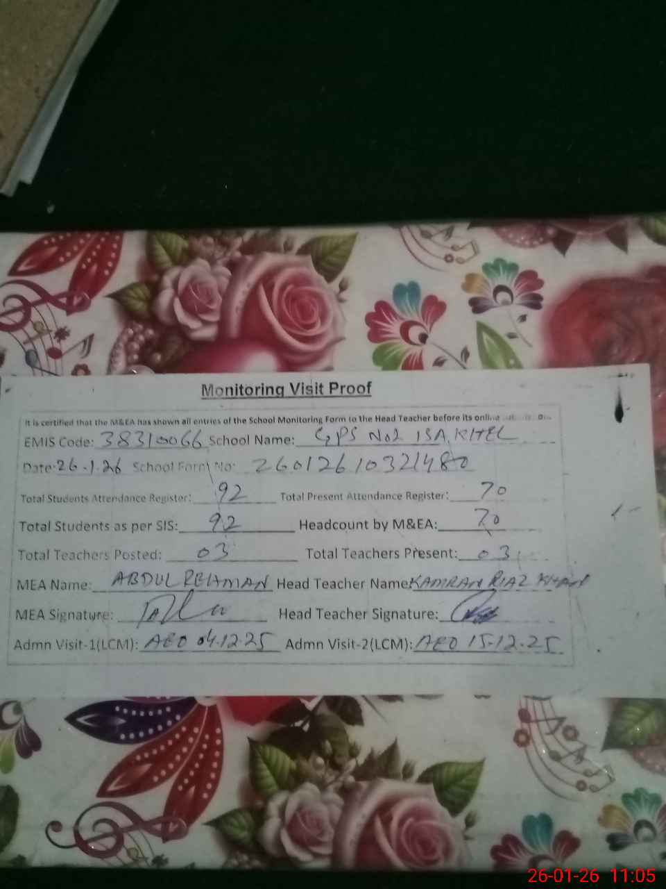 | Attendance Register | Head Teacher | MEA with School | Visit Proof |