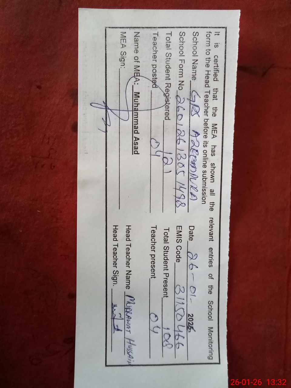 | Attendance Register | Head Teacher | MEA with School | Visit Proof |