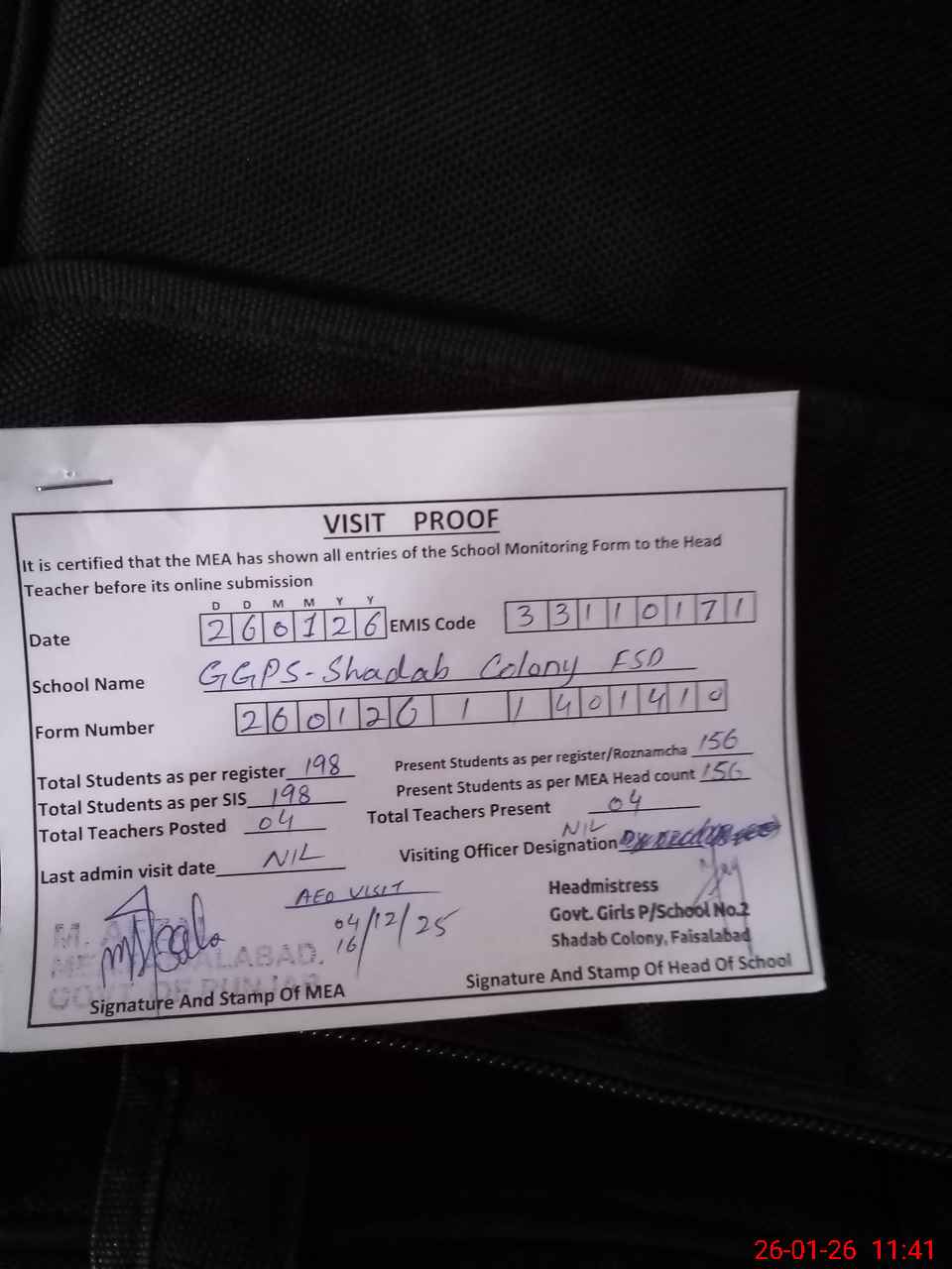 | Attendance Register | Head Teacher | MEA with School | Visit Proof |