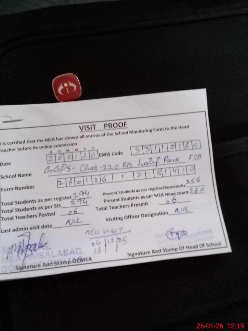 | Attendance Register | Head Teacher | MEA with School | Visit Proof |
