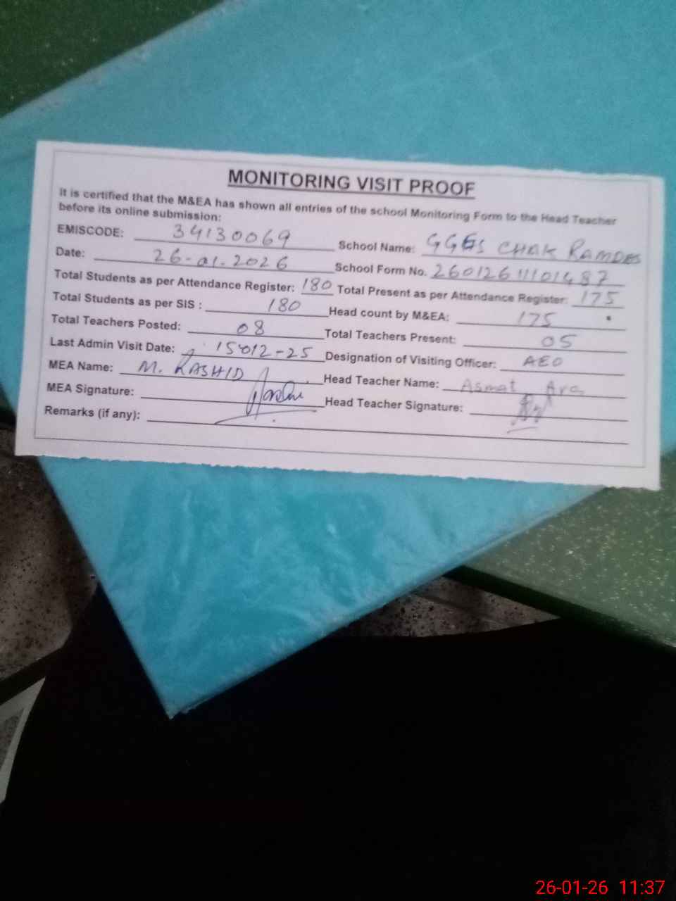 | Attendance Register | Head Teacher | MEA with School | Visit Proof |