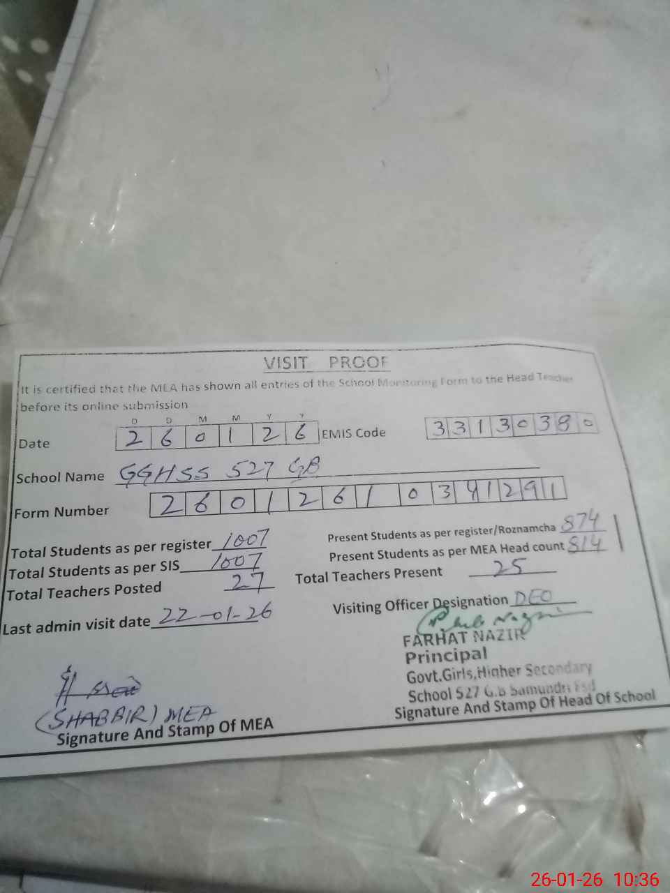 | Attendance Register | Head Teacher | MEA with School | Visit Proof |