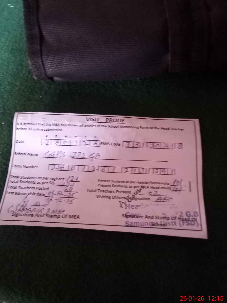 | Attendance Register | Head Teacher | MEA with School | Visit Proof |
