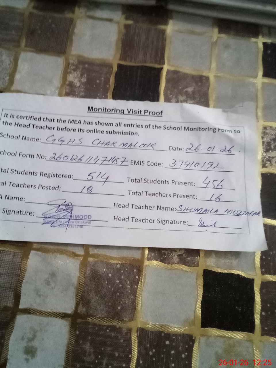 | Attendance Register | Head Teacher | MEA with School | Visit Proof |