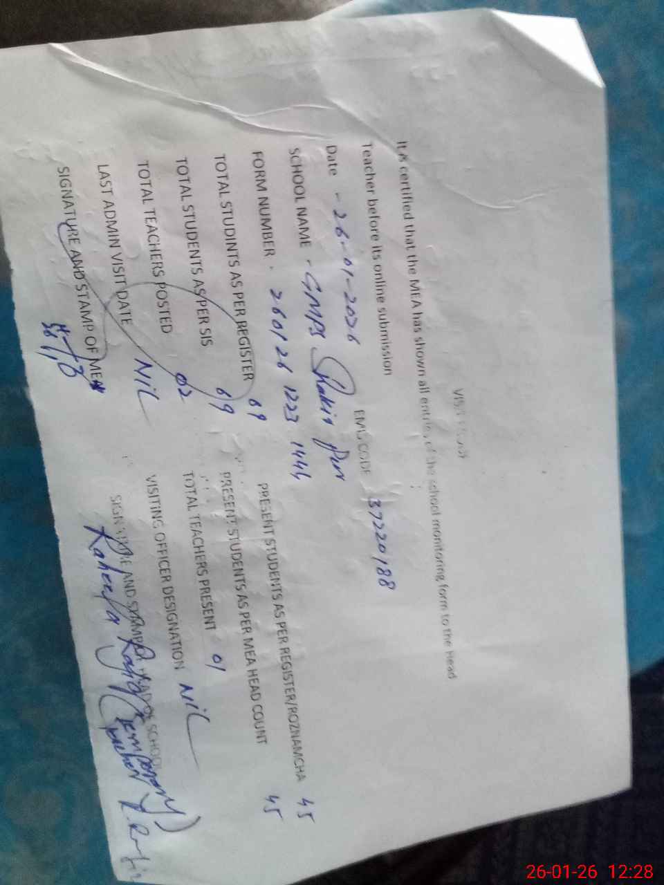 | Remarks (Use Separate Page if Required): PST Kanwal Basheer was continue absent from school from last 6 month but her name is running in MEA Tab. In this school not regular teacher this school is teacher less one teacher is today coming in school temporary PST Teacher Raheela Rafiq but she not shown order for temporary duty from higher authority. | |||||