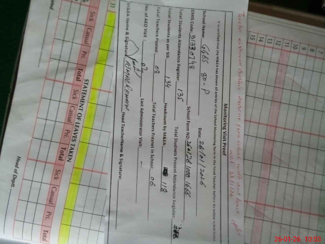 | Attendance Register | Head Teacher | MEA with School | Visit Proof |