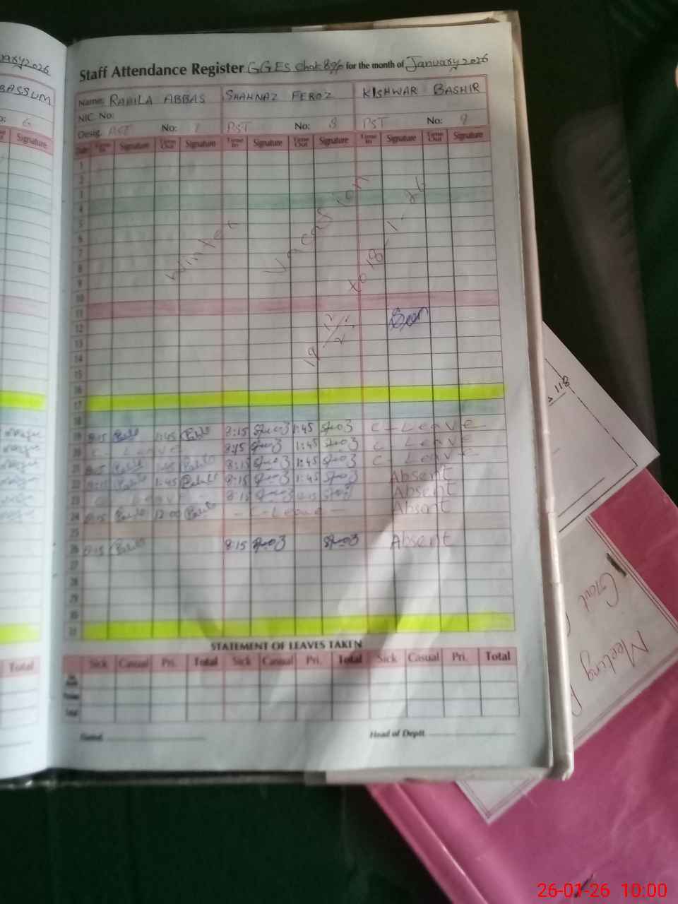 | CNIC | Full Name | Designation | R/C | Absence During Last Calender Month |