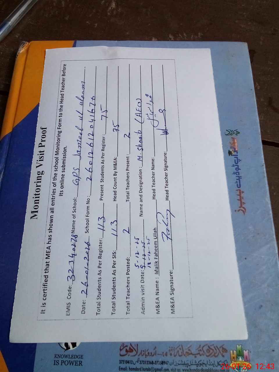 | Attendance Register | Head Teacher | MEA with School | Visit Proof |