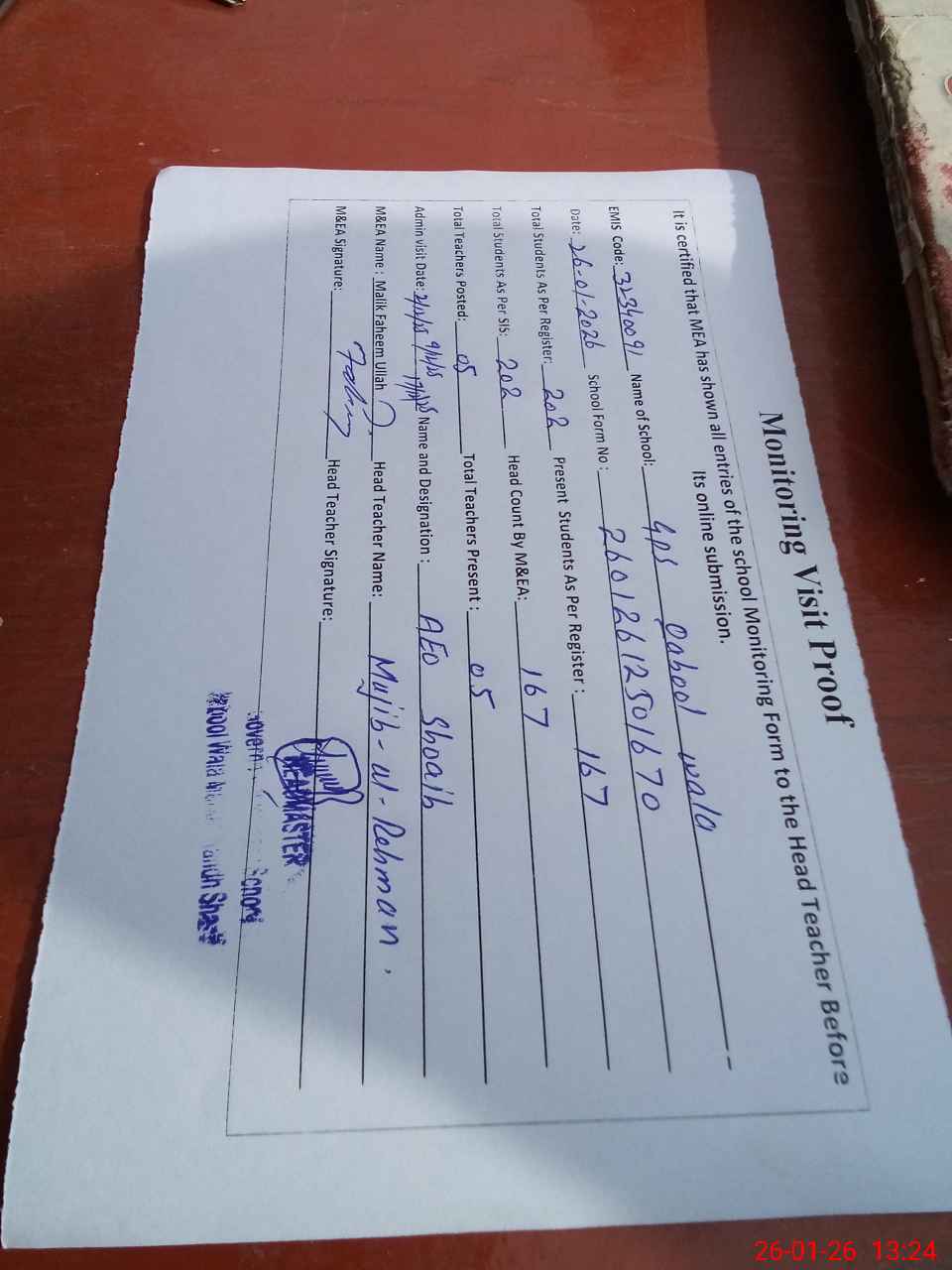 | Attendance Register | Head Teacher | MEA with School | Visit Proof |