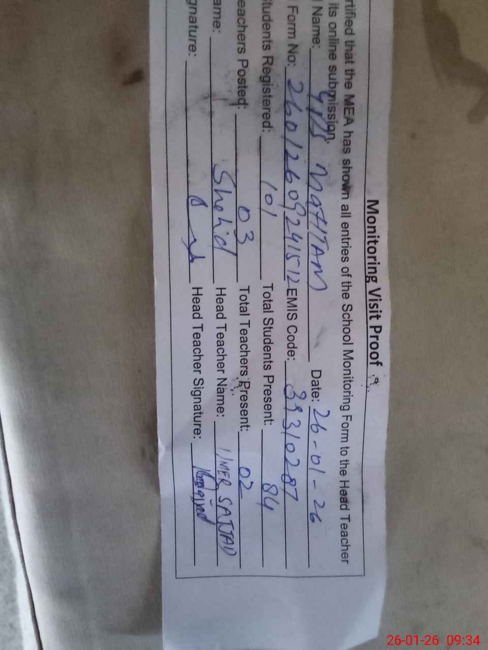 | Attendance Register | Head Teacher | MEA with School | Visit Proof |