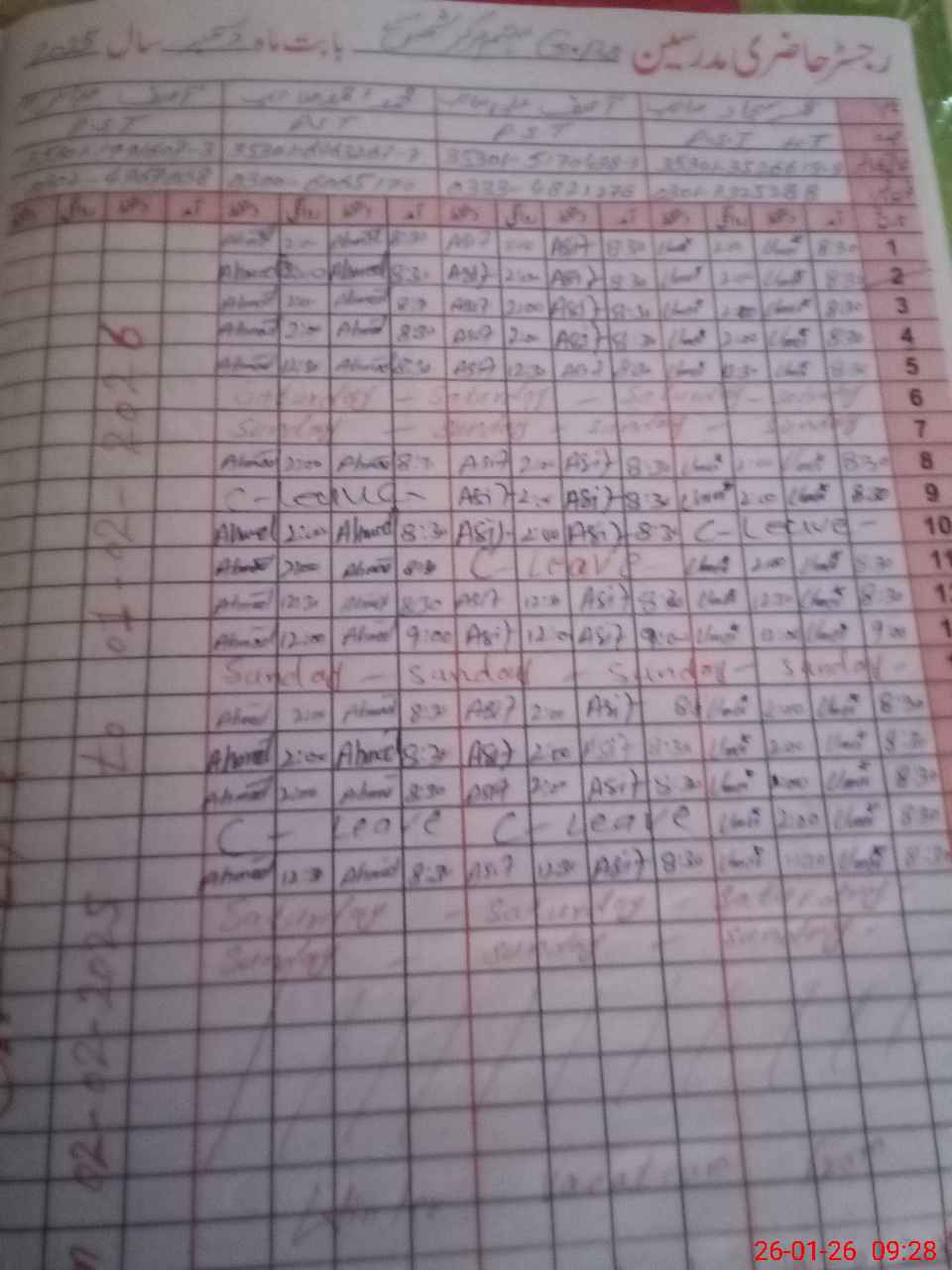 | CNIC | Full Name | Designation | R/C | Absence During Last Calender Month |