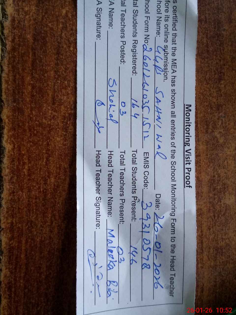 | Attendance Register | Head Teacher | MEA with School | Visit Proof |
